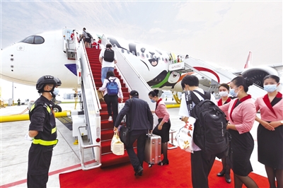 6月27日,在成都天府国际机场,搭乘四川航空公司3U8001航班的旅客陆续登机,这是该机场投入使用后的首个航班。当日,我国“十三五”期间规划建设的最大民用运输枢纽机场——成都天府国际机场正式启用。