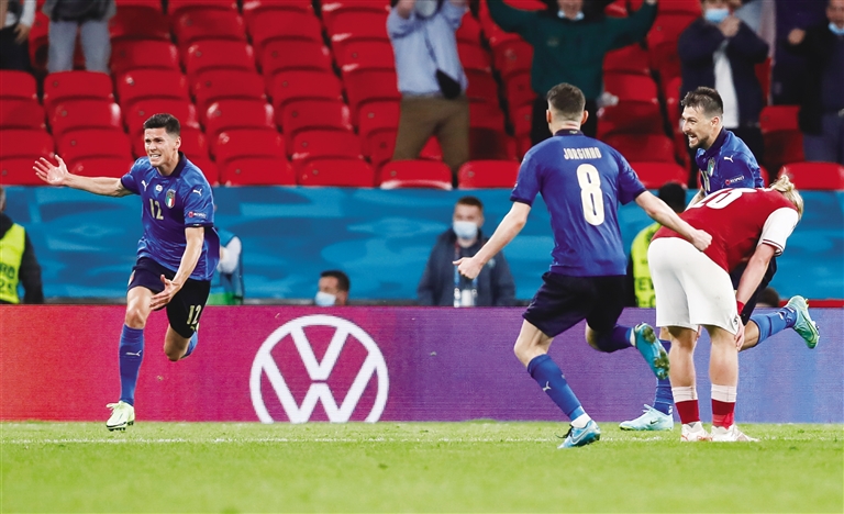 值得一提的是,这是意大利队历史上首次由两名替补队员在加时赛破门。“对一名教练来说,麾下有不同的出色球员制造‘难题’,是一件幸事。”带队书写12连胜的新纪录,曼奇尼很满意拥有一支26名球员同样出色的球队。现在,离开兑现“进军温布利”的口号更近了,但意大利主帅拒绝提前庆祝,“不,还早着呢。我们还差3场比赛。”