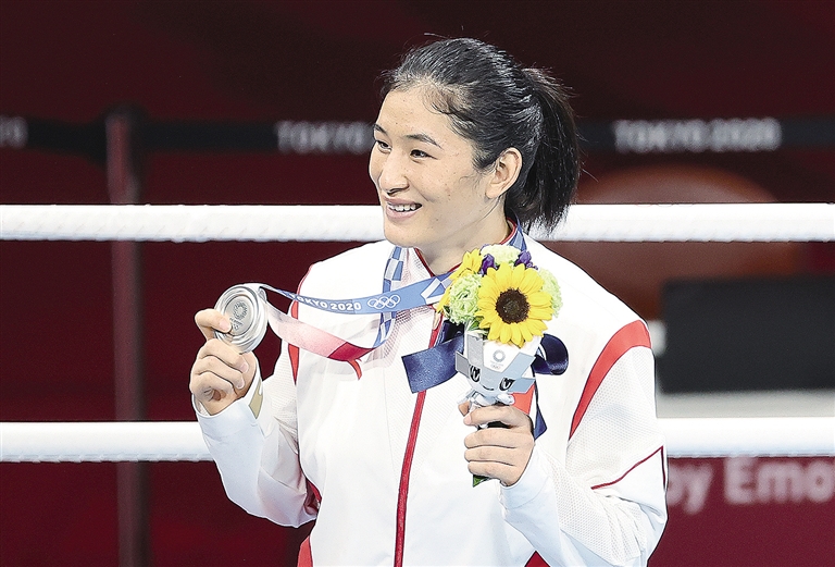 8月8日,内蒙古选手李倩在颁奖仪式上。当日,在东京奥运会拳击女子75公斤级决赛中,代表中国队出战的内蒙古选手李倩不敌英国选手普莱斯,获得银牌。(相关报道见15版)