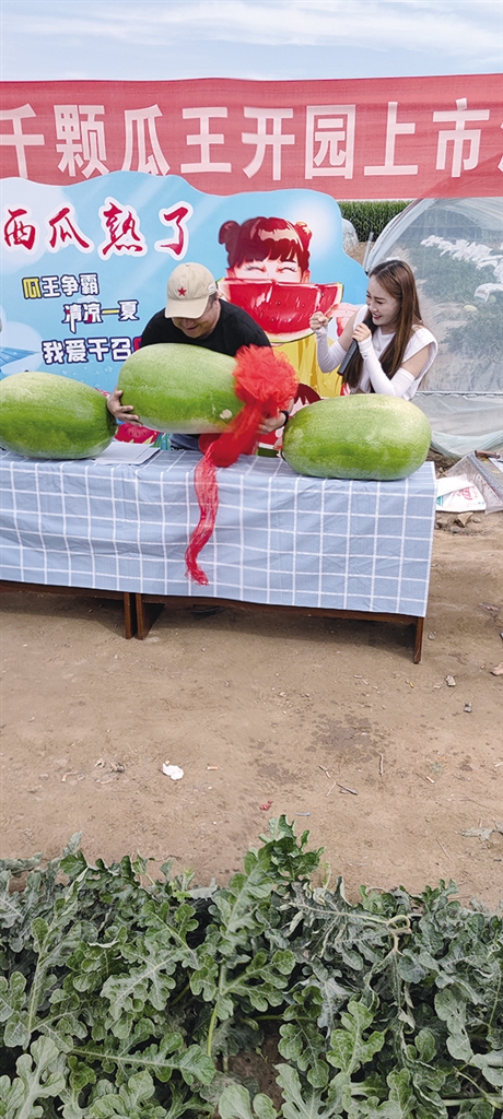 当天,临河区干召庙镇人民政府举办“千颗瓜王开园上市”活动,镇长乔晓庆为大西瓜及当地其他农副产品代言并进行开园切瓜。巴彦淖尔市现代农牧事业发展中心的两名高级农艺师对大西瓜进行现场甜度检测,经检测,大西瓜中心折光糖含量达到12%,远远超出一般西瓜的甜度。现场还举办了“瓜王”评选活动,其中一颗89斤重的大西瓜获得“瓜王”称号。开园仅仅1小时,民主村一组的大西瓜就定出了100多颗,收入7万元。银行工作人员任尚义花2000元买了3颗瓜,“我们买回去供客户品尝,让他们感受一下干召庙瓜王的味道!”