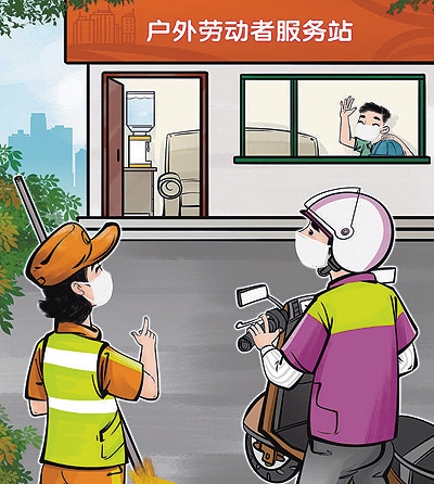 针对环卫工人等户外劳动者“吃饭难、喝水难、休息难、如厕难”等实际问题,各级工会切实帮助改善户外劳动者的工作休息条件,努力使工会的维权服务工作更贴近广大职工群众。截至目前,已建设户外劳动者服务站点78217个,覆盖服务以农民工为主体的户外劳动者群体5900多万人。这正是:建设爱心驿站,工会就在身边。拓展服务内容,升级温暖港湾。(据《人民日报》)