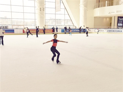上海市闵行区一家大型商业中心的冰场内,分区训练冰球、花样滑冰的孩子们练得热火朝天(如图),有的已经可以在冰面上旋转跳跃。