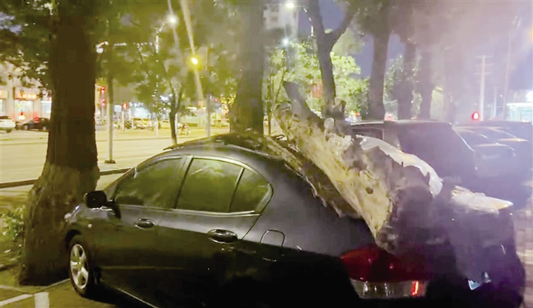 郭女士的爱车被碗口粗的枯树干砸坏,车损严重。