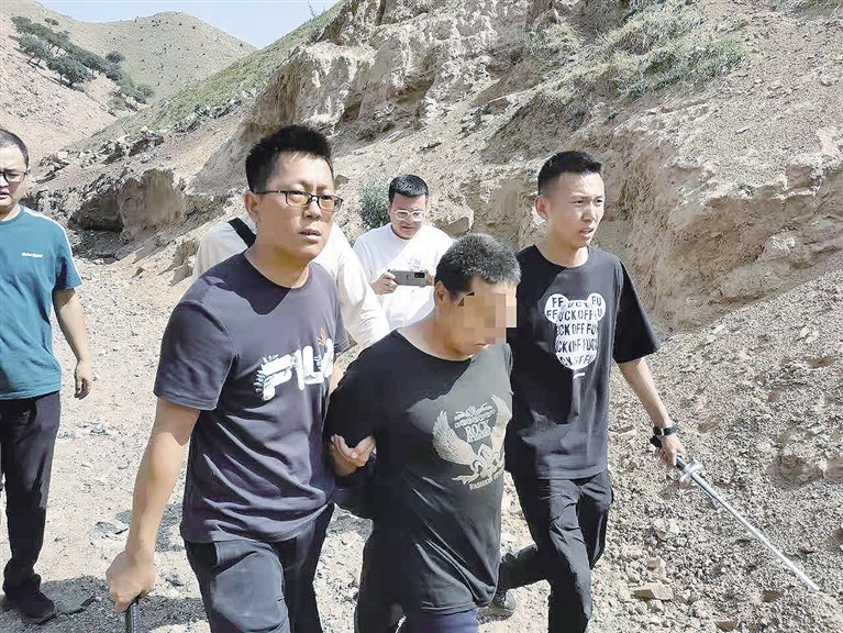 经现场勘验、走访调查,确定犯罪嫌疑人系甘肃籍民工马某某。乌拉特前旗公安局迅速成立专案组,制定侦破方案,当即对犯罪嫌疑人马某某进行上网追逃,同时发布悬赏公告。经专案组分析研判认为,犯罪嫌疑人很可能藏匿在山沟中。17日一早,专案组抽调100余名民警分别从乌拉山山前、山后展开搜山与合围,同时依靠当地牧民群众,发挥人熟地熟的优势,组织民兵群众在案发周边20余公里的山沟内走访查找。各走访排查组徒步翻山越岭,于12时在一山坳中将犯罪嫌疑人马某某抓获(如图)。