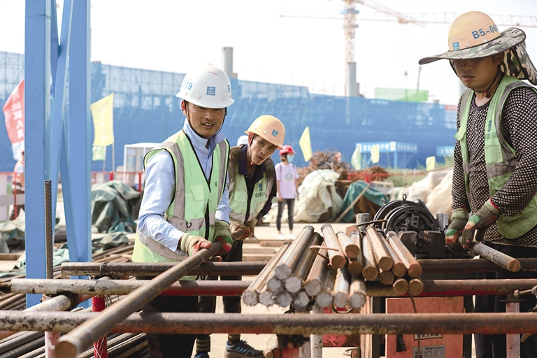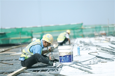 呼和浩特新机场由中建八局承建,自去年7月份动工以来,各项建设工作有序推进,目前已进入机场主体结构施工阶段。当日,记者走进施工现场,“宁绕百步远,不冒一步险”“心中时刻装安全”等安全标语随处可见,工人们头戴安全帽,在自己负责的区域忙碌着,一张张黝黑的脸上挂满汗珠,看到记者后,还激动地喊起口号:“动作要快,姿势要帅……”