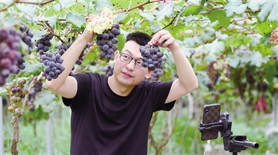 近日,在福建宁德市寿宁县下党乡,返乡创业青年陈上友在葡萄园直播介绍当地果农种植的葡萄。 2020年,从事过电商行业的陈上友回到下党乡创建直播团队,借助直播平台销售当地的茶叶、蜂蜜等农产品。在推进巩固拓展脱贫攻坚成果同乡村振兴有效衔接的过程中,越来越多的“新农人”涌现、活跃在田间地头。这些“新农人”既下得了地、赶得了海、吃得起苦,又能主动学习新技能,积极拥抱互联网,多渠道拓展销路,带动父老乡亲一同向前,共绘产业兴、农民富、乡村美的美好画卷。(据新华社报道)
