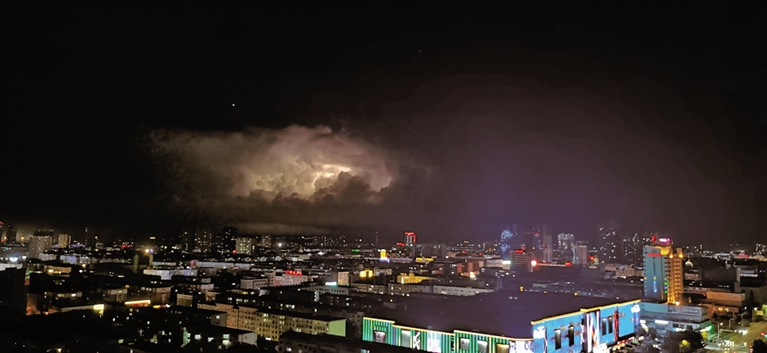 对此,通辽市气象局工作人员王一冰告诉记者,通过观测,这是发生在科左后旗东部的一次极端天气现象,这种云团称为雹暴云团,是通常发生在夏季的一种强对流云团,云团中不仅伴有雷电,还可能伴有大风、冰雹、短时强降水等强对流天气。这种云团发展迅速,移速也快,生命期短,带来的天气现象也非常剧烈,当尺度较小时,云团天气以冰雹大风天气为主。这次通辽市的雹暴云团尺度发展较大,云团向西南方向发展移动,除了雷电外,还伴有强降水天气,科左后旗金宝屯气象站小时雨强达到57毫米,达到暴雨级别。之所以在雹暴云团几十公里外的科尔沁区也能观测到如此神奇的天气现象,是因为当天能见度较高,云体发展又旺盛。
