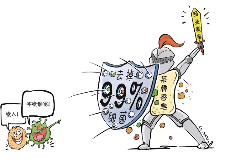 “去除99%细菌”?这条消费者熟悉的广告语,可能要被“去除”了。近日,广州宝洁有限公司因在一款香皂外包装上,将没有充分科学论证的“去除99%细菌”进行突出标注,被罚款20万元,并责令停止违法行为。夸大产品功能,不仅会让消费者产生误解,也涉嫌不公平竞争,使该商品在和同类产品竞争时处于有利地位,损害其他经营者合法权益。(据《北京晚报》)