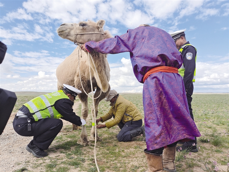 331国道有110多公里处于乌拉特中旗交管大队辖区,辖区沿线居住牧民近300户,放养的牛、马、骆驼等大型牲畜3万多头。自今年年初331国道开通后,流通车辆比较多,经常发生车辆碰撞大型牲畜的交通事故,尤其夜间光线不好,大型牲畜颜色较深,难以提早看清,司机反应时间不足。为此,乌拉特中旗交管大队民警组织331国道沿线牧民开展了发放大型牲畜反光腿带活动。大型牲畜反光腿带反光效果非常好,司机在夜晚开大灯的情况下可以在150米以外发现反光腿带。截至目前,已发放10000多条大型牲畜反光腿带,下一步,将陆续为辖区内331国道沿线3万多头大型牲畜全部佩戴反光腿带。