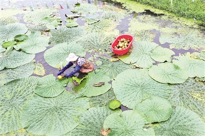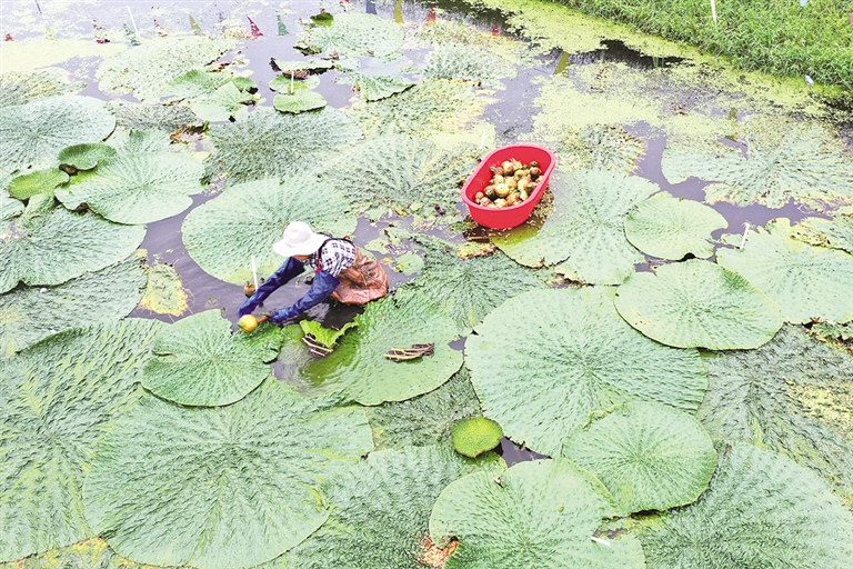8月28日,江苏省常州市天宁区的农民在采收芡实(无人机照片)。 近日,江苏多地种植的芡实进入采收季,种植芡实的水塘里随处可见丰收的繁忙景象。 摄影/胡 平
