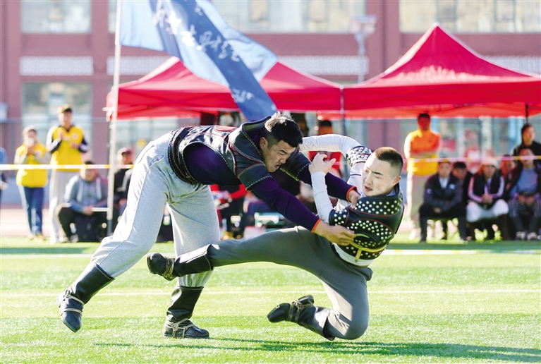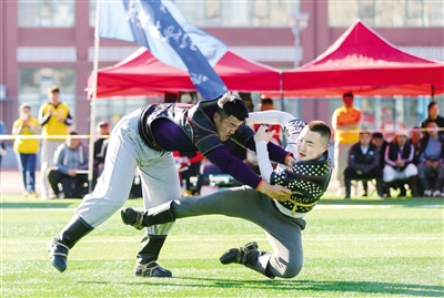 10月18日,两名选手正在进行激烈较量。当日,由自治区教育厅和自治区体育局共同主办的2021年内蒙古自治区学生搏克锦标赛在呼和浩特民族学院开赛,共有278名选手分别在男子团体、女子团体、男子个人、女子个人4个比赛项目中展开激烈比拼。本次比赛旨在进一步发展搏克运动,培养竞技体育后备人才。