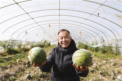 10月17日上午,巴彦淖尔市乌拉特中旗乌加河镇联丰奋斗村种植大户高彪手捧小西瓜乐得合不拢嘴。最近两天,村里20多座拱棚的沙漠1号好联丰有机小西瓜喜获丰收,进入采摘期。据瓜农介绍,这种小西瓜是今年培育的新品种晚熟瓜,皮薄肉厚,口感香甜,每个小西瓜平均重约2公斤,属于绿色无公害水果。摄影/北方新报正北方网记者 张巧珍