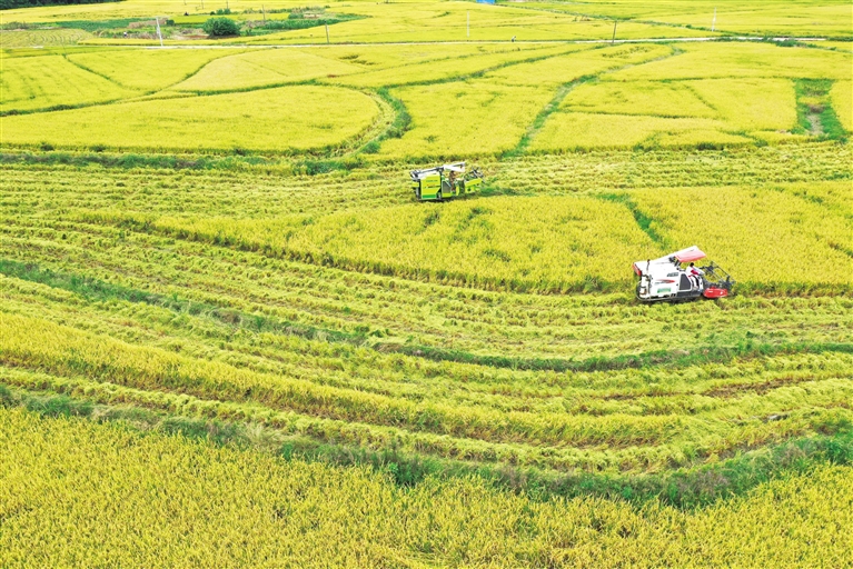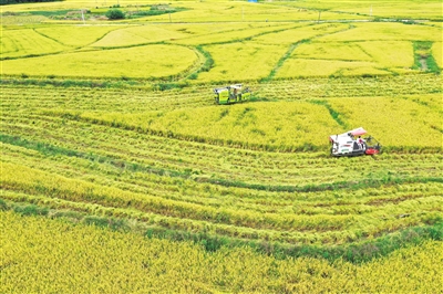 10月17日,湖南省永州市道县寿雁镇涂家村村民驾驶收割机收获晚稻(无人机照片)。