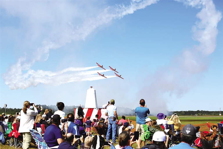 10月16日,观众在美国路易斯安那州哈蒙德市观看飞行秀。去年因新冠疫情取消的美国路易斯安那州哈蒙德北岸地区飞行秀2021年10月16日重启。