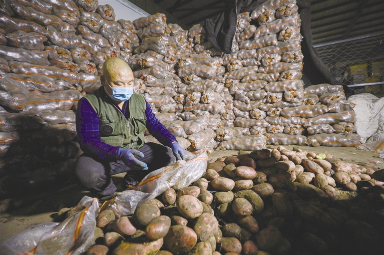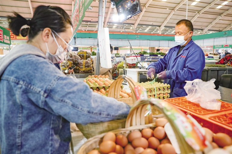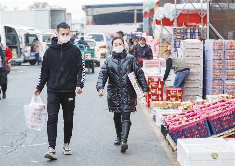 在蔬菜批发大厅内记者看到,各类蔬菜品种齐全,土豆、白菜、油菜、豆角、胡萝卜、香菜等全部装袋堆放在地上,成捆的大葱摞放整齐,刚从地里拔出来的新鲜胡萝卜还挂着泥,过道中车辆进出不断,或开着三轮摩托车前来采购,或开着小型货车满载而归。居住在竹园小区的蔬菜经营商王五明正在将整袋土豆和白菜往三轮车上装,他告诉记者:“疫情再次袭来,为了能让小区居民正常吃上蔬菜,早上4点半就赶到了这里,来了一看,货物供应充足,蔬菜、水果、肉类一样都不少,种类多,菜品还新鲜。”