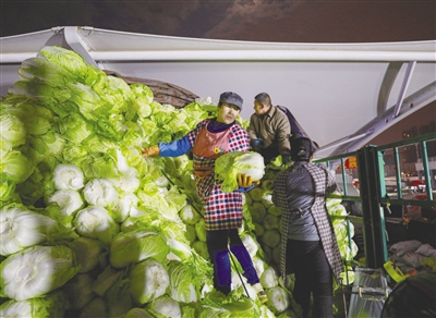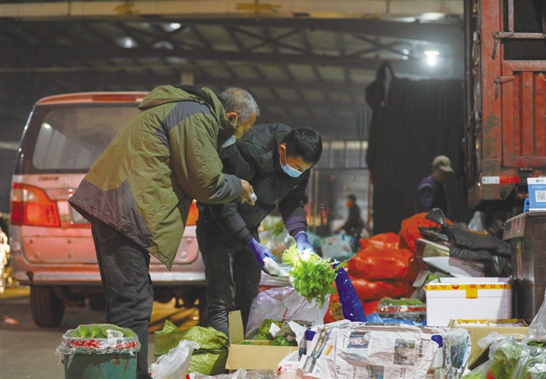 清晨5时,大多数人还沉浸在睡梦中,空荡荡的街道上,偶尔有出租车驶过。此时,在食全食美美通农产品批发市场内,却是另一番热闹景象,这里丝毫没有受到疫情影响,买卖交易有序进行。批发市场内的蔬菜交易区域和蔬菜批发大厅内灯火通明,来自各地的蔬菜运输车辆停得满满当当,挑菜、验货、谈价、装货……到处都是商贩们忙碌的身影,他们忙着整理蔬菜、算账出货,更多的则是来自市区各大蔬菜摊位的小商贩,他们卸菜装菜,将这里的蔬菜转运到市区各大蔬菜销售店,开始送进百姓家中。