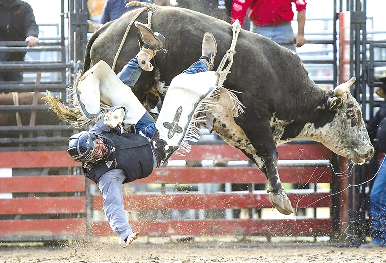 一名牛仔在骑牛竞技赛中从牛背跌落。10月23日,为期两天的2021年加拿大安大略省牛仔竞技赛决赛在奥兰治维尔举行。比赛设有骑牛竞技、骑马竞技、绕杆竞速与绕桶竞速等项目。(据新华社报道)