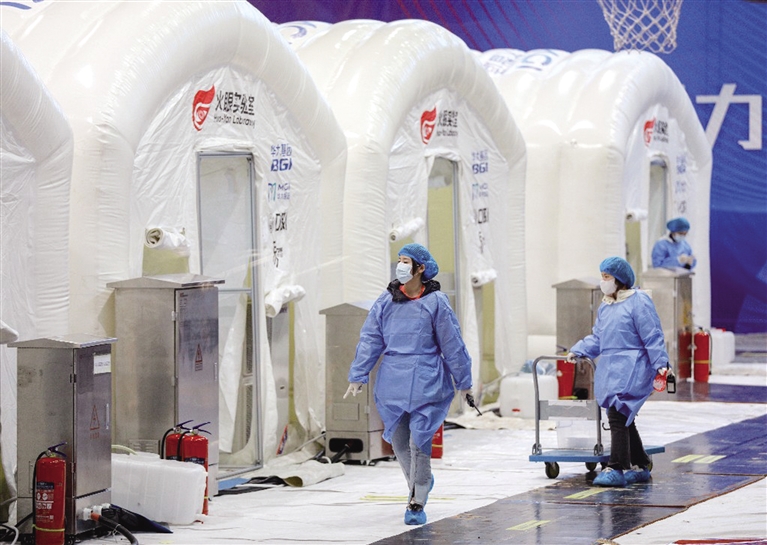 10月26日凌晨,经过不到一天的紧急建设,“火眼实验室”在内蒙古体育馆篮球馆建成并投入使用。受新冠疫情的影响,呼和浩特迅速开展大规模核酸检测。“火眼实验室”可用先进检测技术第一时间发现新冠病毒,设计检测通量为每24小时30万人份级。“火眼实验室”由5个舱组成,分别承担不同模块的实验检测任务,将为呼和浩特疫情防控提供一体化的病原检测解决方案,加速核酸检测工作。 摄影/北方新报正北方网首席记者 牛天甲