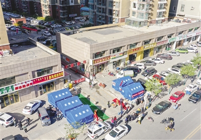 “大家看脚下,每个红点的间距就是一米,大家根据红点有序排队……”当日8时,东风路街道办事处的工作人员卢斌就来到现场忙碌起来,维持秩序、提供咨询服务。据东风路街道办事处城市管理办公室工作人员郝文吉介绍,现场有社区工作人员约30人,保安工作人员约45人,物业工作人员约35人,这些工作人员分布在现场的不同岗位,进行着秩序维持、消杀、信息登记、运送物资等各种工作,24小时不间断为该小区9栋楼1430多户业主提供着服务。