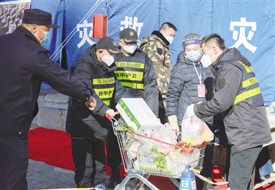只见华侨新村小区的门口拉起警戒线,5顶蓝色的应急救灾帐篷格外显眼,其中一个帐篷外挂着一条写有“疫情就是命令 防控就是责任”的条幅。给封控小区居民送物资的人员在工作人员的指挥下,有序排队并保持着一米距离。小区外围的工作人员负责登记所有送物资人员的个人信息,保安、社区工作者则化身“搬运工”,将送来的物资源源不断地送到小区大门处,再由身穿防护服的工作人员将物资运送到小区内。
