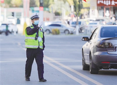 小区外停放着一辆警车,多名民警现场维持着秩序,紧盯着现场,不敢有丝毫松懈。小区门口的两名交警不停地来回巡逻,指挥着小区附近的交通。两名环卫工人也是不间断地巡查路面,垃圾做到随时处理。小区大门口的消杀几分钟进行一次……