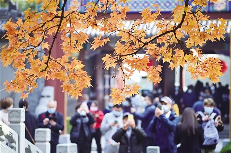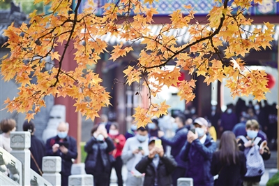 近日,北京香山公园勤政殿前两棵元宝枫叶片开始变色,以红黄为主,还有绿色相称,吸引不少游客驻足拍照。这两棵树被喻为香山红叶的“消息树”,香山红叶目前已进入观赏期。