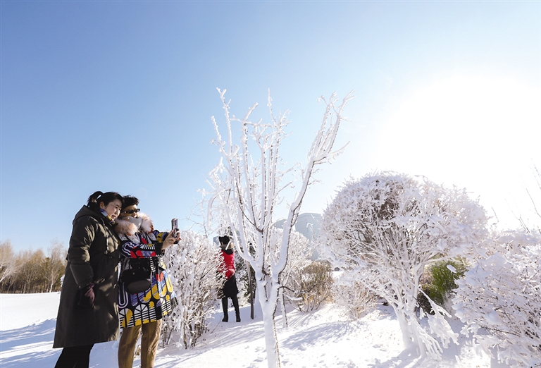1月6日,呼和浩特市民在草原丝绸之路文化公园冰雪景观区拍照。呼和浩特市园林建设服务中心打造的“赏雪景 迎冬奥”主题冰雪景观区陆续在草原丝绸之路文化公园、青城公园等7个街头公园亮相,总造雪面积76470平方米,吸引了许多市民前往赏雪观景。