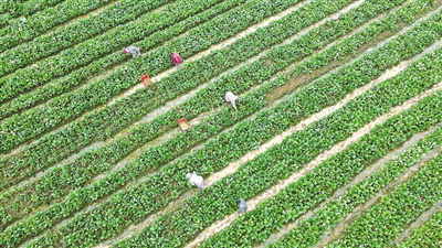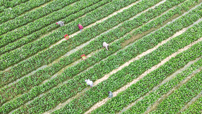 1月5日,在湖南省衡阳常宁市胜桥镇合泉村一家农业科技公司蔬菜种植基地,村民在采收蔬菜(无人机照片)。当日是二十四节气中的小寒,各地农民忙着进行作物管护、采收等作业。 (据新华社报道)
