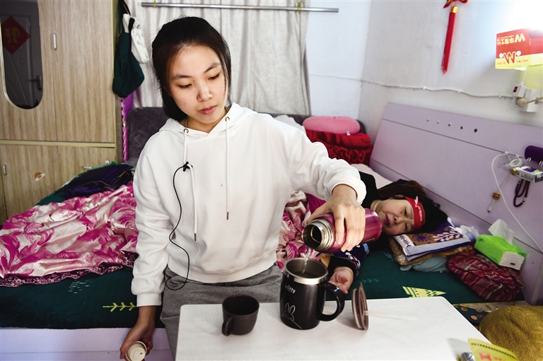 在福州市一处老旧小区一楼的简陋出租屋里,做饭、洗碗、拖地后,王林慧定时为妈妈翻身、按摩、喂水……