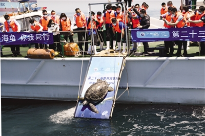 5月23日,工作人员在放归海龟。当日是世界海龟日,以“保护海龟,你我同行”为主题的宣传活动在青岛举行。除举办海龟科普展、发布保护海龟倡议外,5只近期被救助和罚收的海龟在青岛海域放归大海。摄影/新华社记者 李紫恒