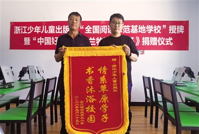 收到精美图书后,苏尼特右旗第三小学校长刘长城将一面写有“情系草原学子 书香沐浴校园”的锦旗赠送给浙江少年儿童出版社,以表达主办方为学校增添新书,丰富学生们阅读生活所作出的贡献。