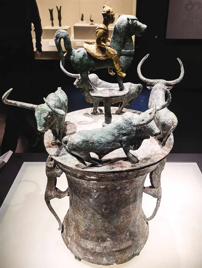 贮贝器代表着当时先进的生产力和审美水平。贮贝器最独特的部分莫过于精美的器盖。盖上的立体浮雕再现了古滇国社会生活的鲜活场景,包括祭祀、战争、纳贡、狩猎、纺织等。比如晋宁石寨山出土的“四牛鎏金骑士铜贮贝器”,器盖上的滇族骑士椎髻跣足、佩剑骑马、通体鎏金,四周环绕着四头巨角隆脊、雄健刚强的封牛。又如“诅盟贮贝器”器盖上的人物竟多达127人……经历了2000多年的风雨变迁,雕饰中的攻伐交战、集市买卖、骑马狩猎、虎豹搏杀依然能够让我们感受到曾经热闹鲜活的场景。