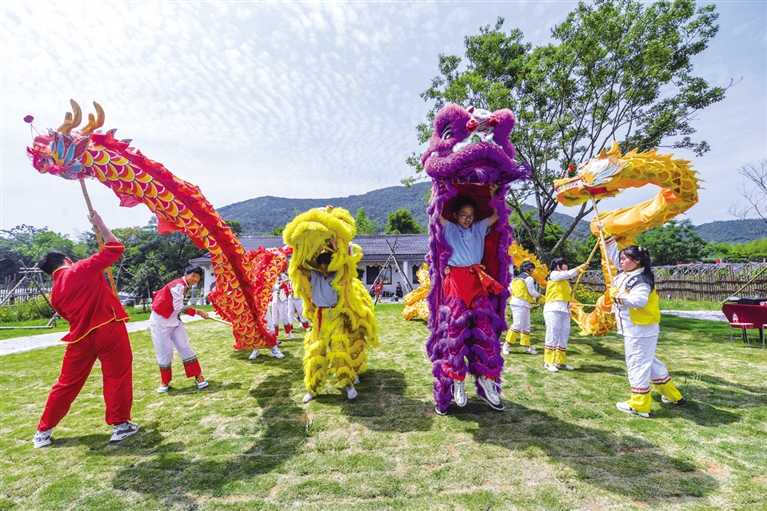 临近端午节,浙江省湖州市吴兴区道场乡邀请湖州市吴兴区城南实验学校的部分学生、老师与党员志愿者参加迎端午特色活动,现场安排舞龙舞狮、包粽子等内容。图为学生们在参加活动。摄影/新华社记者 徐 昱