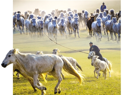 日前,锡林郭勒盟西乌珠穆沁旗的牧民在套马。初夏时节,锡林郭勒盟西乌珠穆沁旗的草原开始返青。当地牧民赶着马匹,来到草原上驯马,景象壮观。摄影/新华社记者 彭 源
