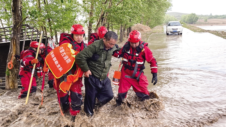 6月11日下午,消防员正在营救被困群众。当日,受强降雨影响,锡林郭勒盟太仆寺旗辖区内水位持续上涨,太仆寺旗宝昌镇、红旗镇等地遭洪水围困,部分车辆和农田被淹,消防救援部门迅速赶赴现场开展救援工作。太仆寺旗消防救援大队当日共营救被困群众4人,疏散200余人。 文/北方新报正北方网记者 张巧珍 摄影/杨东升
