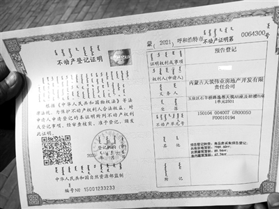 6月15日,记者来到玉泉区石羊桥路逸都天筑小区,据小区居民介绍,逸都天筑小区A、B座,是由内蒙古天筑伟业房地产开发有限责任公司开发的,回迁与对外销售相结合,小区现有约340户居民。此楼盘于2008年开始拆迁,2014年10月交付。购房时开发商和住户签订的是内部认购协议书,付款时开具的是收据,也没有进行过网签。2014年10月领钥匙时,除全部交清房款外,开发商又以代办房本为由,向住户收取了契税、维修基金等费用。近几年,呼和浩特市房地产遗留项目集中办理,小区居民也找到开发商及相关部门,希望早日拿到房本。在小区居民的努力下,2021年逸都天筑A、B座终于办下大产权证,并进行了“不动产预登记”。可即便这样,开发商还是迟迟不给办理分户。“我们多次找到开发商,开发商一直说分户需要实际测量,还没有测完。后来我们才知道,测量是假,开发商把我们的契税、房屋维修基金约500万元给花了,所以分户的房本办不下来。2021年8月份,呼和浩特市自然资源局给我们出具的不动产登记证明上,已经明确了房屋建筑面积和套内建筑面积,开发商也按照认购协议与不动产登记证明上的面积收取了面积差价。开发商所说的还在进行分户测量,明显就是在说谎!”一位业主拿着不动产登记证明对记者说。