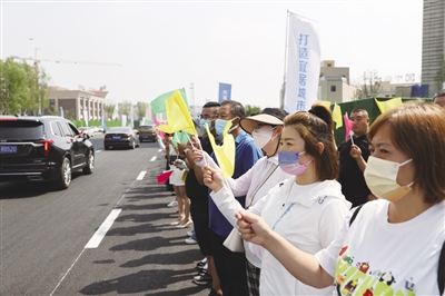 在包头大街通车仪式现场,市民代表推动通车杆,道路两侧周边居民摇旗欢庆,共同见证道路通车。
