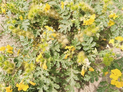 据了解,刺萼龙葵又名黄花刺茄,是一种原产于北美洲的一年生有毒植物,是国家重点防控的外来入侵生物之一。其耐干旱、耐瘠薄,繁殖能力极强,很容易在新的生态环境中占据领地,严重抑制其他作物生长,且植株上的刺有毒,对人和牲畜中枢神经系统有显著麻醉作用,是具有重大潜在危害的外来入侵物种。
