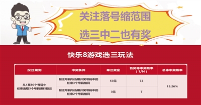 规则:若投注号码与当期开奖号码中的任意三个号码相同,即中奖,单注中奖金额53元;若投注号码与当期开奖号码中的任意两个号码相同,即中奖,单注中奖金额3元。