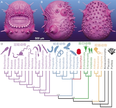 “皱囊虫的一些关键特征,比如发育表皮又叫角质层、上皮不具纤毛、末端的口和环口的辐射对称排列的结构,均表明它和蜕皮动物有更近的亲缘关系。”张华侨指出,皱囊虫更可能是蜕皮动物而不是后口动物。