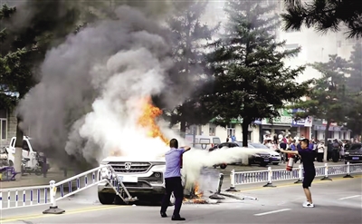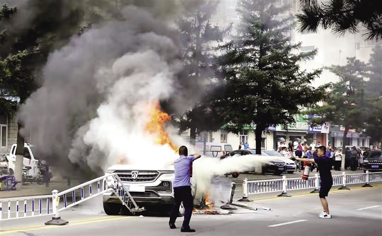 8月21日9时左右,赤峰市宁城县,一辆越野车撞向护栏起火,现场火光冲天。正在休假的赤峰市消防救援支队宁城县消防救援大队消防员刘英杰(右)路经此地,立刻冲向火场,和现场一名群众用灭火器合力控制火势。随后,接警的消防车到达现场实施救援,成功将火扑灭。