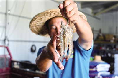 8月25日,园区工作人员展示养殖的对虾。乌海市海南区巴音陶亥镇的盐碱水对虾养殖园区地处黄河岸边,园区2021年在盐碱地里试养南美白对虾,今年获得成功。盐碱地变对虾田,不仅提高了盐碱地的利用率,也将带动当地村民致富。摄影/新华社记者 刘 磊