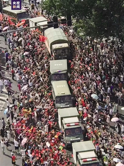 11点,下山路两边站满了送行的群众。人们带着矿泉水、牛奶、糕点、水果和鲜花,翘首盼望英雄的身影。