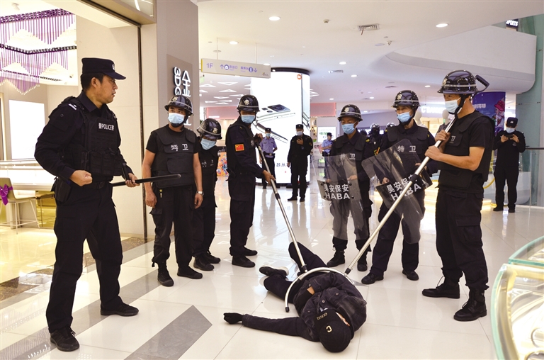 本次演练设定的“犯罪嫌疑人”模拟持刀对金店进行抢劫,导购人员立即吹响口哨,并大声呼救请求支援,店内成员第一时间持店内警械装备对“犯罪嫌疑人”进行干扰、控制,商场楼层安保小组迅速集结同时对店内导购人员和顾客迅速有序撤离。