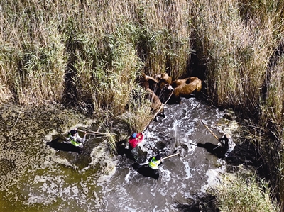 接到报警后,派出所的移民管理警察携带工具赶往现场,了解情况后向上级申请支援。为防止在芦苇丛生的湖泊内迷失方向,民警们通过警用无人机锁定被困骆驼的位置,指挥地面搜救人员寻找。在大家的相互配合下,一峰峰被困骆驼被成功搜寻到,警民合力将骆驼从水中驱赶到岸边。