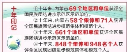 全区各地全面深入持久开展民族团结进步创建进机关、进企业、进社区、进乡镇、进学校、进连队、进宗教活动场所、进网络等活动,民族团结进步创建成果丰硕。十年来,内蒙古69个地区和单位获评全国民族团结进步示范区示范单位,58个集体和71人获评全国民族团结进步模范集体和模范个人。