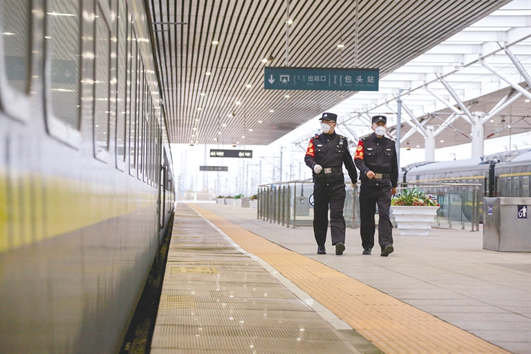 11月14日,包头铁路公安处民警在包头东站巡逻。连日来,包头铁路公安处管辖内各车站派出所在配合地方政府、铁路企业开展好站车疫情防控的同时,严守站车安全防线,扎实做好抗疫情、防风险、护安全、保稳定各项工作,确保铁路运输和人民生命财产安全。