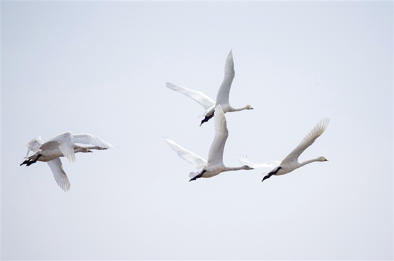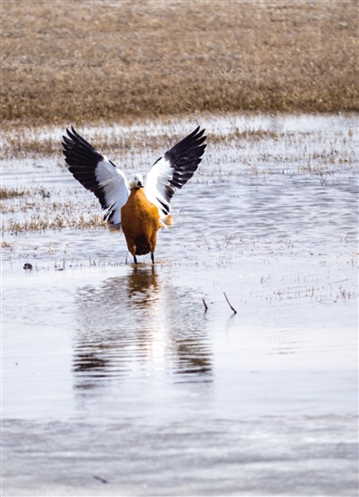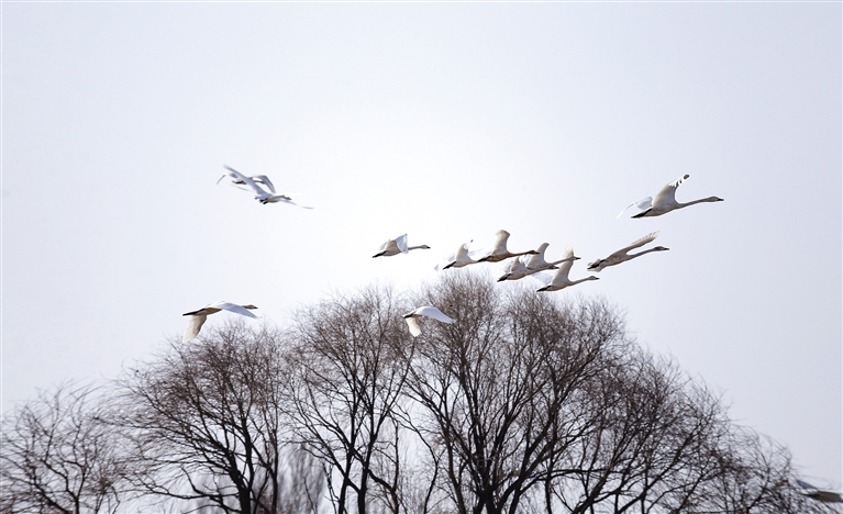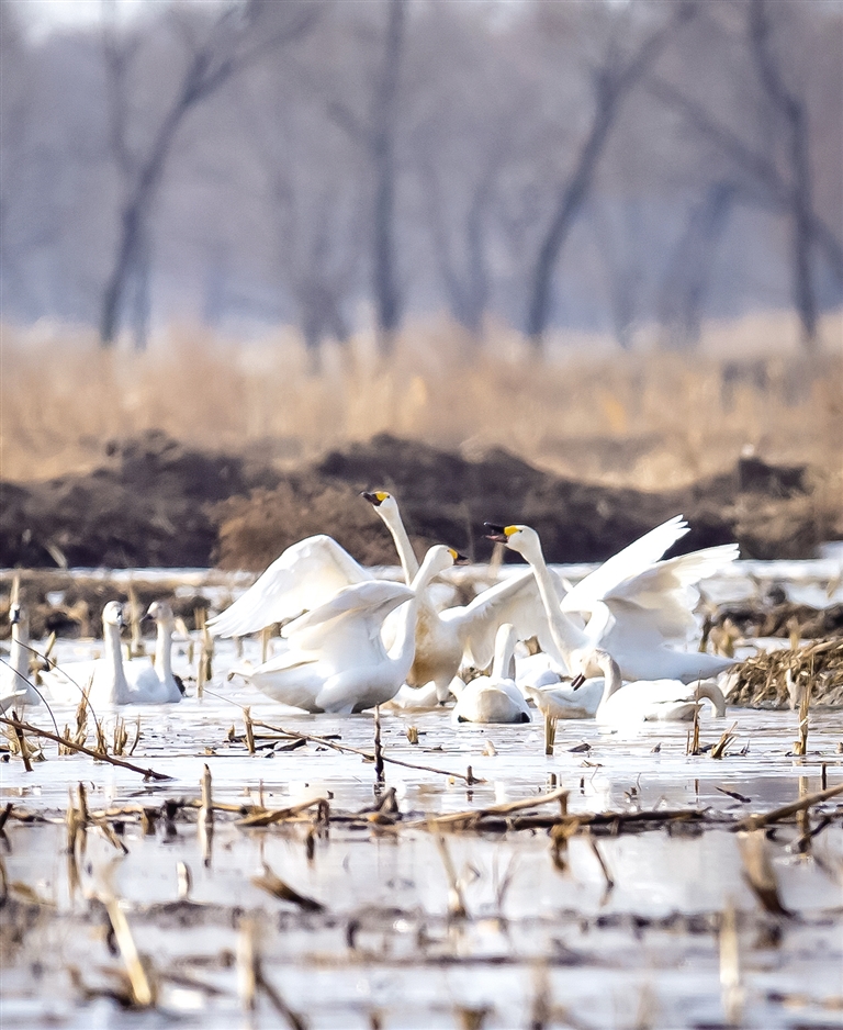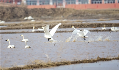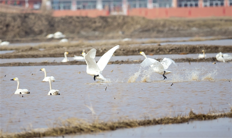 春雷响,万物长。随着呼和浩特气温逐渐转暖,冰雪消融,万物复苏,春耕春灌的序幕就此拉开。3月15日,记者在紧邻黄河灌区的土左旗北什轴乡店上村、托克托县一间房村等地的田间地头看到,大片灌满水的庄稼地里有数以千计的白天鹅、赤麻鸭、灰鹤、白鹭、红嘴鸥等远道而来的候鸟在这里栖息,它们时而引吭高歌,时而翩翩起舞,时而高空盘旋,时而水中嬉戏、低头觅食,给寂静的村庄带来无限生机。 “我是过来观鸟的,已经蹲守两天了,这里的天鹅足有上千只!”在北什轴乡店上村附近,正在拍照的刘先生说。