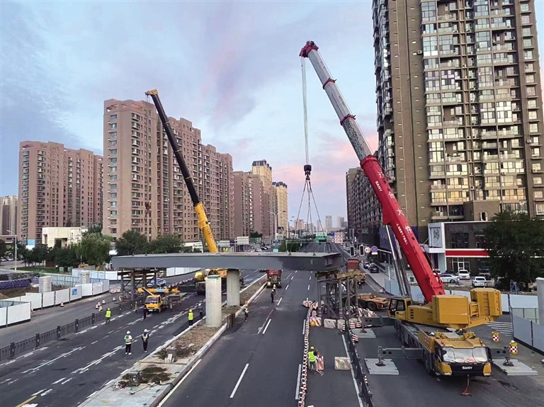 7月28日,腾飞路上跨南二环快速路新建工程首片钢箱梁架设成功,标志着该工程从桥梁墩身逐步转入桥梁上部结构施工,进入了新的建设阶段。据了解,腾飞路上跨南二环快速路工程位于呼和浩特市赛罕区腾飞南路与南二环快速路交会处,是今年呼和浩特市的重点建设项目,也是完善路网的重要举措。截至目前,全线已完成桩基36根,承台5座,桩系梁3座,立柱16根,预制箱梁30片。