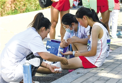 比赛结束后,医疗团队立刻为王佳琪包扎了伤口。“摔倒的时候没多想,只想着跑下去才对得起这段时间训练备战的付出!”比赛结束后,王佳琪对记者说。